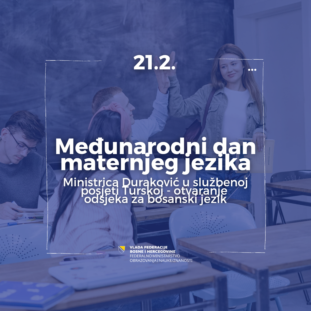 Povodom 21. februara/veljače, Međunarodnog dana maternjeg jezika, koji je ustanovio UNESCO s ciljem promovisanja jezičke i kulturne raznolikosti, federalna ministrica obrazovanja i nauke/znanosti, prof. dr. Jasna Duraković, upućuje čestitku svim građanima i građankama Bosne i Hercegovine, naglašavajući da je maternji jezik temelj ličnog identiteta, ali i zajedničkog društvenog razumijevanja.